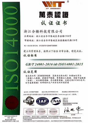 公司被評為“國家高新技術企業”,并有多個產品獲得“國內發明專利”,通過了FSSC22000食品安全體系認證,ISO14001環境管理體系,MUI HALAL認證,SKS KOSHER認證,ISO9001質量管理體系和ISO22000食品安全管理體系認證,并有多個產品通過了“歐洲REACH法規”注冊和“韓國REACH法規” 預注冊。